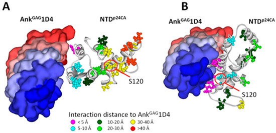 Nineteen amino acids having polymorphic residues present in the docking complexes of AnkGAG1D4 (PDB code: 4HLL and NTDp24CA (PDB code: 2LF4). AnkGAG1D4 bound to helix 1 (A) AnkGAG1D4 bound to helix 7 (B). The atom style represents the residues on the NTDp24CA (in ribbon style) interacting with AnkGAG1D4 (surface form). The colour of the atom style indicates the distance between the NTDp24CA residues and AnkGAG1D4 in which pink, cyan, dark green, light green, yellow, and orange indicate distances at <5 Å, 5–10 Å, 10–20 Å, 20–30 Å, and 30–40 Å, >40 Å, respectively. The variable residue, S120 (40.46%), is outside the binding pocket residues in the case of AnkGAG1D4 bound to helices 1 and 7 of the NTD.