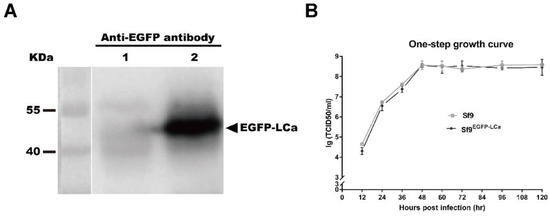 Stable polyclonal cell lines were selected after the transfection of Sf9 cells with pIB/V5EGFP-LCa in accordance with the manufacturer’s specifications (pIB/V5-His Vector Kit, Invitrogen). Briefly, the cell line expressing EGFP-LCa was constructed by transfection with plasmid pIB/V5EGFP-LCa, and was then selected with the antibiotic Blasticidin (Invitrogen). Millicell hanging cell culture inserts (Merck Millipore, Darmstadt, Germany) were used to isolate clonal stable cell lines as described previously [35]. The clonal cell lines were examined under confocal imaging, and the cell line that had the appropriate fluorescently-labeled marker was selected for western blotting analysis and live-cell imaging. The cell line SfEGFP-EGFP was analyzed using an anti-EGFP antibody (ProteinTech, Wuhan, China).
