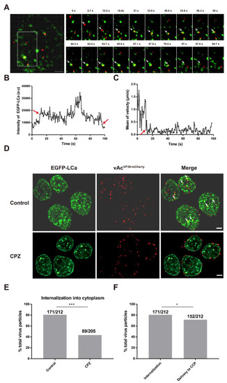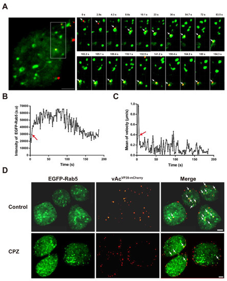After internalization, AcMNPV particles were delivered to early endosomes. Cells (Sf9EGFP-Rab5) expressing EGFP fused to the early endosome marker Rab5 were infected with virus vAcVP39-mcherry. Selected frames from a virus particle (vAcVP39-mCherry, red) delivered to early endosomes (EGFP-Rab5, green) are shown in Figure 3A and Video S2. The virus particle underwent rapid movement until being delivered to an early endosome. After delivery to the early endosome, the fluorescence intensity of EGFP-Rab5 suddenly increased due to the beginning of colocalization with early endosomes (indicated with an arrow) (Figure 3B). When the virus particles were delivered to early endosomes, the virus particles were trapped in early endosomes, which made the mean velocity of the virus particle remarkably decreased (Figure 3C). Early endosomes undergoes homotypic fusion events to maturate into late endosomes [24]. Subsequently, the intensity of EGFP-Rab5 colocalized with the virus particle continued to increase (Figure 3C), indicating that the virus-bearing early endosome underwent fusion to mature. Thereafter, the fluorescence intensity of EGFP-Rab5 decreased gradually, indicating that the virus particle was gradually released from the early endosome (Figure 3C). Cells were incubated with vAcVP39-mCherry in the presence or absence of CPZ.