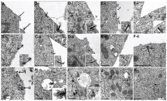At first, AcMNPV particles bound to the cell surface (Figure 5A) and interacted with the cell surface (Figure 5B), indicating that spikes of virus particles had bound to receptors on the cell surface. Subsequently, the virus particles diverged to enter cells through two different pathways. AcMNPV particles were predominantly internalized by endocytosis. The virus particles were initially internalized with obvious invagination (Figure 5(C-i)). Later, the invagination was enlarged (Figure 5(D-i)) until the entire particle was completely invaginated (Figure 5(E-i)). Virus particles were then observed to be located in the extreme periphery of the cell (within a distance of 200 nm from the cell membrane), indicating that virus-bearing vesicles had been formed (Figure 5(F-i)).