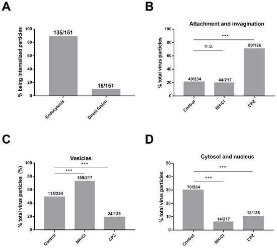 Quantitative ultrastructural analysis of AcMNPV entry into Sf9 cells. Sf9 cells were pretreated with CPZ or ammonium chloride (NH4Cl) before infection. The inhibitors were present throughout the experiment. Sf9 cells without pretreatment with inhibitors were included as a control. Quantitative analysis of about 200 cell sections was performed for each group. All the virus particles observed, such as intact viral particles and nucleocapsids without envelope, were recorded for analysis. (A) The percentage of virus particles that entered via endocytosis and direct fusion with the plasma membrane over the particles being internalized. (B–D) Three different stages of viral infection were observed and analyzed: the percentage of internalization (attachment to the plasma membrane and invagination, (B), trafficking in vesicles (single and multiple virus particles, (C), and the presence of nucleocapsid in the cytosol and nucleus (D). *** indicates p < 0.001, Pearson χ2 test.