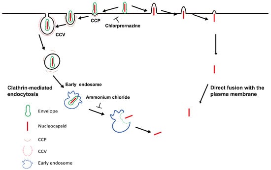 Enveloped viruses infect cells by binding to the receptors on the plasma membrane and manipulating the host cell for trafficking and replication. Clathrin-mediated endocytosis and fusion with the plasma membrane are the most common pathways that viruses adopt for infection [20,21]. During clathrin-mediated endocytosis, ligands bind to receptors at the cell surface and are then delivered to clathrin-coated pits (CCPs). The CCPs then recruit more clathrin to mature into clathrin-coated vesicles (CCVs) [22]. Later, the ligands and receptors are internalized into the cytoplasm, and delivered to early endosomes for sorting to different organelles [23]. By contrast, ligands that enter cells via direct fusion with the plasma membrane are independent of CCPs, CCVs, and early endosomes. Instead, the ligands are directly released into the cytosol.