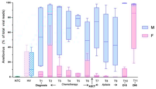 Proportion of anellovirus reads in NTC, HV, and ASCT recipients. The median of anellovirus reads proportion (among total viral reads) obtained from the 10 ASCT recipients and 8 HV is represented according to gender. One NTC (nuclease free-water processed through the metagenomics workflow) per batch was used to evaluate the contamination. The median value of anellovirus is also represented for the NTC. NTC: no-template control; HV: healthy volunteers; ASCT: autologous stem cell transplantation; F: female; M: male.