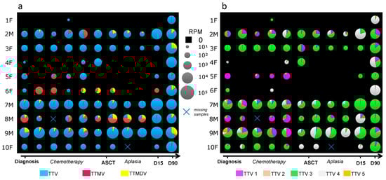 Anellovirus abundance and composition among the 10 ASCT recipients from diagnosis to 90 days post-ASCT (a) Kinetics of TTV, TTMV, and TTMDV (b) Kinetics of the 5 TTV genogroups. TTV: torque teno virus; TTMV: torque teno mini virus; TTMDV: torque teno midi virus; ASCT: autologous stem cell transplantation; F: female; M: male. RPM: reads per million mapped reads.