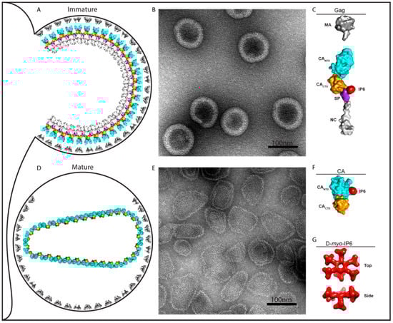 Role of IP6 on immature and mature assembly. (A) Drawing of an immature virus particle budding from cellular plasma membrane. (B) Negative stain EM image of immature-like virus particles assembled in vitro with IP6. (C) Depiction of Gag molecule from (A) showing IP6 bound at the interface of CACTD and SP. (D) Drawing of a mature virus particle. Following cleavage of Gag, IP6 promotes the formation of the mature lattice by CA. (E) Negative stain EM image of IP6-induced assembly of HIV-1 CA protein into mature-like virus particles. (F) Depiction of CA molecule from (D) with IP6 bound. (G) Top and side-view of IP6 d-myo-IP6, the most abundant isoform, with one axial and five equatorial phosphates. Note that in diagrams A and C, the viral envelope proteins and the RNA genome and associated proteins are not shown.