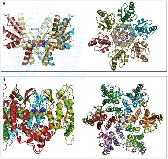 Immature and mature HIV capsid hexamers in complex with IP6. (A) Immature hexamer with location of the two lysine rings indicated by side-chains and blue spheres. Numbering is given for Gag with CA in parenthesis. Based on PDB 6BHR. The left-hand panel is annotated so that the lysine side chains belonging to K290 are immediately below the K290 label while those belonging to K359 are immediately above the K359 label. In the right-hand panel, the inner ring of blue spheres corresponds to lysines at position K359 while the outer ring of blue spheres corresponds to lysines at position K290. (B) Mature hexamer with R18 ring indicated by yellow side chains and blue spheres. Two R18 rotamer conformers are shown. Based on PDB 6ES8. In each side-view, one monomer has been omitted for clarity.