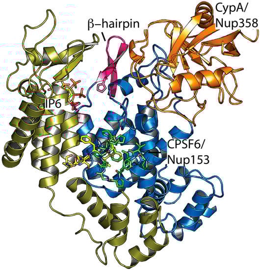 Ligand interaction sites on two adjacent monomers in the mature HIV-1 capsid hexamer. Superposition of complexed structures of CPSF6 (4U0B), Nup153 (4U0C), Nup358 (4LQW), and IP6 (6ES8). Two hexamer monomers are shown in blue and gold, CypA/Nup358 in orange, CPSF6 and Nup153 peptides in green and yellow, IP6 as atom colored sticks, and the β-hairpin in pink.