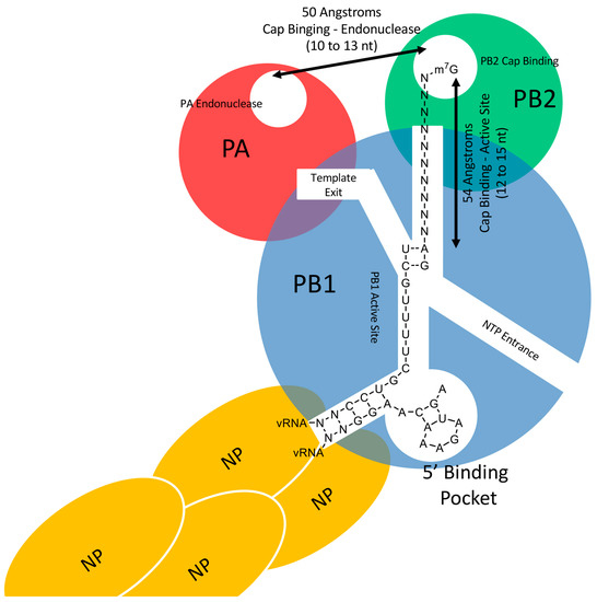 The IAV RdRp is a heterotrimeric complex comprised of polymerase basic protein 1 (PB1), polymerase basic protein 2 (PB2), and polymerase acidic protein (PA). PB1 forms the core of the polymerase [7]. It contains conserved motifs typical of RNA-dependent RNA polymerases [8,9]. The PB2 and PA subunits are involved in the cap-snatching process. PB2 binds to the 5′ cap of nascent transcripts while PA cleaves host pre-mRNA 10–13 nucleotides downstream of the cap structure.