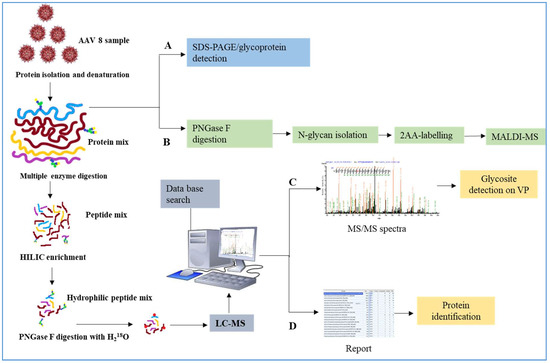 AAV has a complicated capsid structure consisting of multiple units of VP1, VP2 and VP3. Figure 1 details our methodology for characterizing AAV capsid glycosylation. SDS-PAGE was used to detect the protein profile of the virus and the presence of any host cell proteins, copurified. Additional glycoprotein staining techniques along with N-glycan analysis using MALDI-MS and LC-MS were used. Both HCP and AAV capsid glycosylation were investigated.