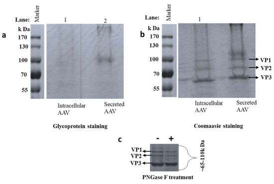 AAV8 Glycosylation detection. AAV8 derived from the cell (intracellular), and media (secreted) are separated on SDS-PAGE (a) protein bands visualized after glycoprotein staining. Glycosylated bands were observed near the AAV8 capsid protein (VP) region (55–100 kDa). Gel (b) is gel (a) stained with Coomassie brilliant blue to visualize the whole protein profile. (c) Independent Coomassie stained gel run after de-N- glycosylation of secreted sample. (+ and − the addition of PNGase F).