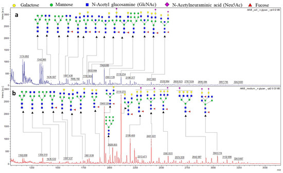 The intracellular and secreted AAV8 samples were both treated with PNGase F in preparation for N-glycome analysis. The N-glycans of corresponding samples were isolated and tagged with 2 Aminobenzoic acid (2-AA) then spotted on MALDI-plate to provide unique N-glycan profiles of the corresponding samples. The resulting spectra were smoothed, and the baseline subtracted. The MS/MS of high-intensity peaks were performed in “Lift mode” to confirm the monosaccharide composition. The peak annotation was done using the Glycoworkbench software following verification by the CFG database (Figure 3). Since the protein identification data suggested the presence of host cell glycoproteins in the samples, the N-glycosylation profile of the secreted and intracellular AAV8 cannot be directly linked to the AAV8 capsid protein (VP). However, the high intensity of secreted AAV8 glycan spectra correlates with the glycoprotein detection data and suggests the possibility of AAV8 interaction with host cell glycans. The majority of the N-glycans identified in the sample were terminally galactosylated, indicating the capsid protein’s affinity to the terminally galactosylated HCPs. The glycoforms are identical in structure in both samples (Table S1). The difference in proportion and intensity of each glycoform is noticeable (Figure 3).