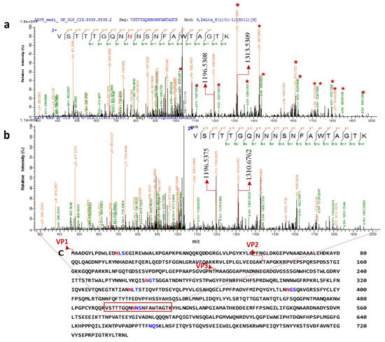 To obtain peptide mass fingerprinting data, samples were prepared by in-solution digestion. Peptides were run on Orbitrap to obtain the peptide mass fingerprinting data. Consensus sequence search of N- glycosylation NXT/S through GlycoMod revealed 6 possible glycosites; N14LS, N263GT, N338LT, N385GS, N499NS, and N665QS (Figure 4C). Aside from N14, every other site is in the common region of VPs. N14, is in the N-terminal domain and looped inside the capsid assembly [10]. Thus, the analysis of glycosylated peptide focused on VP3 sequence due to the presence of all predicted glycosylation sites and abundance of peptide in the total sample.