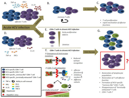 The role of the hepatitis C virus (HCV)-specific T cells in HCV infection. (A) Viral clearance is associated with strong T helper and cytotoxic T lymphocyte responses and high levels of IL-21. (B) After viral clearance the effector cell population decay and the T cells differentiate into a memory population with the ability to self-renewal. (C) The memory T cells are able to rapidly reactivate effector functions and to proliferate in case of antigen re-stimulation. (D) Viral persistence is associated with a reduced CD8 T cell frequency and weaker T cell responses compared to patients that spontaneously clear the virus. (E) During chronic HCV infection CD4 T cells exhibit early proliferative defects followed by a CD4 T cell deletion. (F) CD8 T cell responses are impaired during chronic HCV infection due to viral escape mutations and T cell exhaustion. Viral escape mutations cause reduced epitope recognition by CD8 T cells. T cell exhaustion is caused by an ongoing antigen-stimulation and characterized by a loss of effector functions and an increased expression of inhibitory markers. Different subsets of exhausted T cells have been defined. “Memory-like” CD8 T cells are characterized by high expression of T-bet, transcription factor T-cell factor 1 (TCF-1) and CD127, whereas “terminally exhausted” CD8 T cells express high levels of PD-1 and Eomes. (G) After therapy with direct acting antivirals (DAAs) a lymphocyte proliferation can be observed, accompanied by the restoration of effector functions. After DAA treatment “memory-like” CD8 T cells are detectable, but terminally exhausted CD8 T cells disappear. The role of CD4 T cells after therapy with DAAs is still unclear.