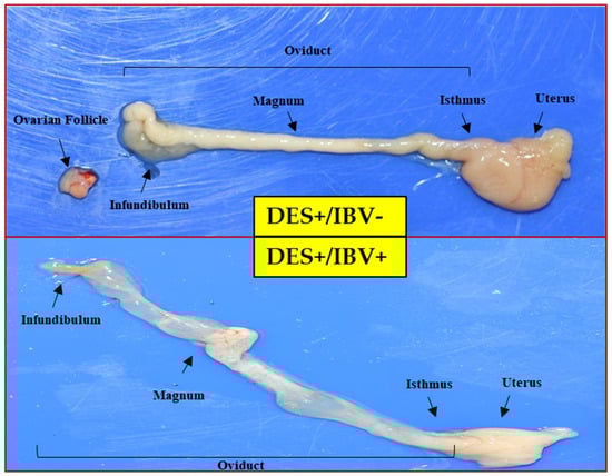 To investigate the influence of IBV on the premature reproductive organs of the chicks, we induced the sexual precocity by DES (Sigma) treatment []. A total of 48 1-day-old SPF female chicks (BioPOA Co., Yongin, Korea) were distributed into four different groups. Three groups were inoculated with BP-caKII, K2, and KM91 (106.5 EID50/100 µL/chick) via ocular and intranasal routes, and a DES-control group was not inoculated with virus. A total of 12 birds were assigned to each group. After inoculation with each virus, the dead chicks were excluded when comparing reproductive tract lesions. At 5, 8 and 11 days after virus infection, all chicks were inoculated with DES intramuscularly (1 mg/100 µL) and were observed for clinical signs and mortality for 2 weeks after the challenge and were euthanized by cervical dislocation at 2 weeks post-infection. During the experiment, all chicks were reared in air-filtered isolators (THREESHINE, Daejeon, Korea) and feed and water were provided ad libitum. Gross lesions of the reproductive tract were examined based on cyst formation (four-grade-scoring: Negative, moderate, + (cyst covering less than 20% of oviduct), marked, ++ (covering 20% to 50%), and severe, +++ (covering more than 50% of oviduct)), and the presence or absence of caseous material in the oviduct.