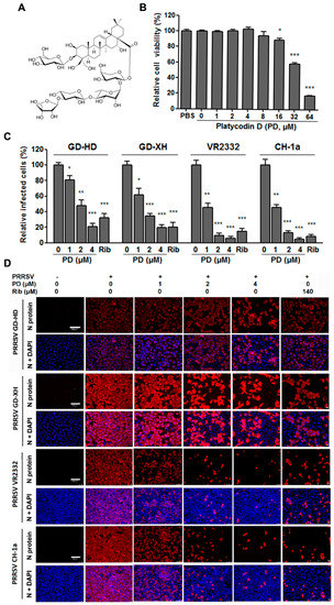 APA StyleZhang, M., Du, T., Long, F., Yang, X., Sun, Y., Duan, M., Zhang, G., Liu, Y., Zhou, E.-m., Chen, W., & Chen, J. (2018). Platycodin D Suppresses Type 2 Porcine Reproductive and Respiratory Syndrome Virus In Primary and Established Cell Lines. Viruses, 10(11), 657. https://doi.org/10.3390/v10110657