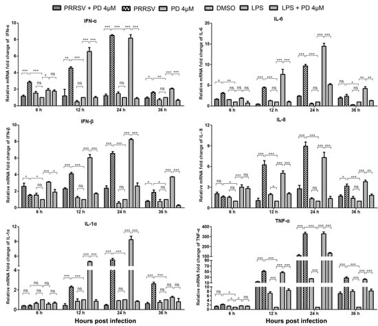 3.8. PD Treatment Reduces Cytokine Gene Expression by PRRSV-Infected PAMs