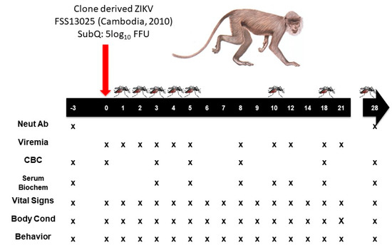 In the present study, four adult cynomolgus macaques were subcutaneously inoculated with 5 log10 focus-forming units (FFU) of ZIKV (infectious clone-derived strain FSS13025, Asian Lineage, Cambodia, 2010) and underwent a 28-day monitoring period during which weight, temperature, and samples of blood and other body fluids (tears, urine, saliva) were collected. Cohorts of low generation (F4) Ae. aegypti were allowed to feed on anesthetized animals periodically to assess susceptibility. At the end of the study period, each animal was euthanized, and tissues were collected for examination of histopathologic changes and ZIKV persistence in sites such as the reproductive tract, central nervous system, and lymph nodes.