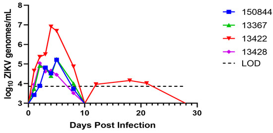 In our study, viremia peaked between 2 to 5 dpi with maximum titers of 6.9 log10 genome copies/mL (13422) and 5.1 to 5.3 log10 genome copies/mL (13428, 13367 and 150844). Although direct comparisons of these results to other NHP studies is not possible due to differences in methodologies as well as the blood element assayed (i.e., whole blood vs serum vs plasma) [63,64,65,66,69,71], previous reports have demonstrated cynomolgus macaque viremia peaking between 5 log10 and 6.6 log10 genome copies/mL [62,66,71]. Human viral load has been found to range from 1 to 5 log10 genome copies/mL [50,51,52,53], with the larger values corresponding to serum samples from cutaneous capillary beds [51]. Of the four macaques we infected, 13422 demonstrated the highest viremia, which fell below the limit of detection (≈3.9 log10 genome copies/mL) by 10 dpi before a second peak of ≈4 log10 genome copies/mL was observed and sustained from 12–21 dpi (Figure 2). Bimodal viremia is a feature that has been described previously in both cynomolgus and rhesus macaques [62,63,64,69,75]. Given that the magnitude and duration of host viremia are critical elements to arboviral acquisition by vector mosquitos [86], standardizing subsequent studies to be more reflective of human disease will important. As most ZIKV viremia is reported in the context of symptomatic patients [50,51,52,53], in which viral burden is known to be significantly less than pre-symptomatic patients [87], it may be difficult for peak human viremia be identified. Nonetheless, as a significant determinant of mosquito infection [86], determining a more accurate human viremia profile will be critical in the development of subsequent animal and ecological models.
