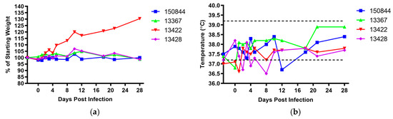 Weight change and rectal temperatures. Following anesthesia on specified days (−3, 0, 1, 2, 3, 4, 5, 8, 10, 12, 18, 21, and 28 dpi), animals were (a) weighed and (b) rectal temperatures were taken. Weights represented by % of individual animal’s weight on the day that study commenced (3 days prior to infection). Macaque 150844 seen in blue, 13367 in green, 13422 in red and 13428 in purple. Dotted lines in (b) represent upper and lower bounds of the range for normal cynomolgus macaque rectal temperatures [81].