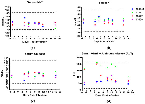 Serum Biochemistries. Sera was analyzed utilizing the VetScan VS2 system. (a) serum Na+ in mmol/L, (b) serum K+ in mmol/L, (c) serum glucose in mg/dL, and (d) serum alanine aminotransferase in IU/L. Macaque 150844 seen in blue, 13367 in green, 13422 in red and 13428 in purple. Dotted lines represent upper and lower reference ranges for analytes.