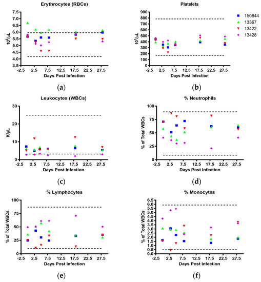 Hematological Values. Whole blood collected in K2EDTA tubes was utilized to perform complete blood counts using the HemaVet 950 system. (a) erythrocytes in 106/µL, (b) platelets in 103/µL, (c) leukocytes in K/µL, (d) neutrophils as % of total leukocytes, (e) lymphocytes as percentage of total leukocytes, and (f) monocytes as % of total leukocytes. Macaque 150844 seen in blue, 13367 in green, 13422 in red and 13428 in purple. Dotted lines represent upper and lower reference ranges for analytes.