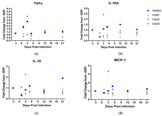 Serum Cytokine Profile. Sera taken from macaques on -3, 1, 3, 5, 12 and 21 dpi were subjected to multiplex analysis for cytokine levels. (a) TGFα, (b) IL-1RA, (c) IL-10, and (d) MCP-1. Macaque 150844 seen in blue, 13367 in green, 13422 in red and 13428 in purple. All data points represented as fold change relative to value observed 3 days prior to infection.