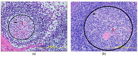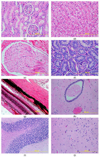 Lymph nodes, spleen, kidneys, liver, eyes, testicles, cerebral cortex, cerebellar cortex, spinal cord and spinal nerve roots were examined upon necropsy (Figure 7). Lymph nodes and spleen (Figure 7a,b) showed non-specific changes related to the systemic viral infection that consisted of immune activation with presence of germinal centers in lymphoid follicles and periarteriolar lymphoid sheets in the spleen (Figure 7b). No other organs showed any histopathologic changes.
