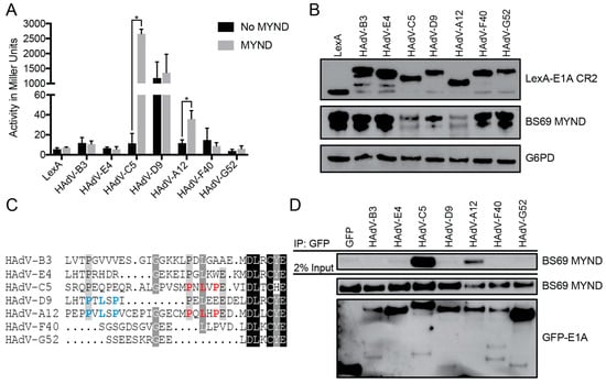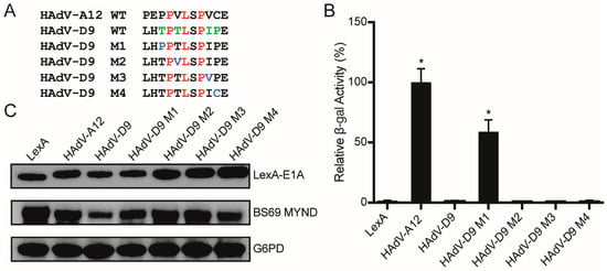 CR2 of HAdV-B3 (residues 85–150), -E4 (residues 91–145), -C5 (residues 93–139), -D9 (residues 84–138), -A12 (residues 80–125), -F40 (residues 78–132), and -G52 (residues 78–130) were cloned using PCR to amplify the specified region from full-length E1A and ligated into the pBAIT backbone vector []. The various E1A fragments and substitution mutants were generated using self-annealing oligonucleotides that were inserted into the pBAIT backbone vector to generate LexA DNA-binding domain (DBD) fusion proteins. These short E1A fragments were designed with a preceding flexible “SGG” linker to minimize the possibility of steric interference from the DBD. Alanine scanning mutants were constructed using overlap extension site-directed mutagenesis [] and cloned into the pBAIT backbone vector. The wildtype (WT) BS69 construct (residues 46–602) was kindly provided by Dr. Rene Bernards (Netherlands Cancer Institute, Amsterdam, The Netherlands) and the MYND domain (residues 427–602) was amplified using PCR and cloned into the EcoRI and SalI sites of pJG4-5 (Clontech, Palo Alto, CA, USA) to fuse BS69 to a B42 activation domain. The pSH18-34 (Invitrogen, Carlsbad, CA, USA) reporter plasmid contains 8× LexA binding sites upstream of a LacZ reporter gene. Sequences encoding the largest E1A isoform of HAdV-C5, -D9, -A12 and -F40, as well as L115 HAdV-C5 E1A were cloned into the pM (Clontech, Palo Alto, CA, USA) backbone vector to generate GAL4 DBD (residues 1–147) fusion proteins. BS69 wildtype (residues 46–602), MYND (residues 427–602), and ∆MYND (residues 46–426) constructs were cloned using PCR to amplify the specified region and ligated into a modified pcDNA3 vector (Invitrogen by Thermo Fisher Scientific, Carlsbad, CA, USA) that includes an N-terminal HA tag. The pGL2-(GAL4)6-Luc reporter vector consists of 6× GAL4 binding sites and a minimal TATA box upstream of a luciferase reporter gene. The largest E1A isoforms of HAdV-B3, -E4, -C5, -D9, -A12, -F40, and -G52 were cloned into a pEGFP backbone vector to generate E1A proteins with an N-terminal GFP tag as previously described [].
