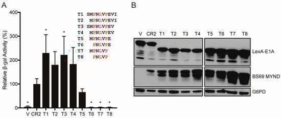 Mapping the minimal BS69 interacting region in HAdV-C5 E1A CR2. (A) Vectors expressing the indicated E1A truncation mutants and BS69 MYND domain were transformed as bait and prey respectively in yeast. Sequences of the E1A truncation mutants, T1–T8, are shown in the legend beside the graph. V = vector control, where HAdV-C5 E1A CR2 was co-transformed with an empty prey vector. Results are shown as mean ± SD of percent activity normalized to E1A CR2, n = 4. Significance markers are assigned in comparison to the CR2 positive control (* p ≤ 0.05). (B) Western blot of yeast cell lysates to confirm protein expression. Two blots were run concurrently in parallel to include all the samples. Bait and prey proteins were visualized using anti-LexA DBD and anti-HA antibodies respectively. G6PD was used as a loading control. V = vector control.