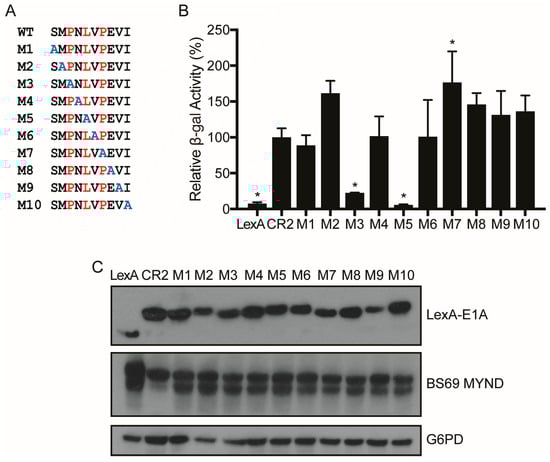 Determination of specific residues of HAdV-C5 E1A CR2 required to interact with BS69. (A) Sequences of the E1A CR2 point mutants, M1–M10, used to determine the importance of specific residues within and adjacent to the HAdV-C5 E1A PXLXP motif for interaction with BS69. (B) Vectors expressing E1A CR2 point mutants and BS69 MYND were transformed as bait and prey respectively in yeast. Results are shown as mean ± SD of percent activity normalized to HAdV-C5 CR2, n = 3. Significance markers are assigned in comparison to the CR2 positive control (* p ≤ 0.05). (C) Western blot of yeast cell lysates to confirm protein expression. Bait and prey proteins were visualized using anti-LexA DBD and anti-HA antibodies respectively. G6PD was used as a loading control.