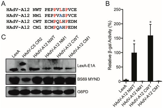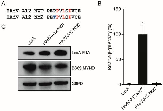 Analysis of BS69 interaction with the two putative PXLXP motifs present in the HAdV-A12 E1A protein. (A) Sequences of the motifs corresponding to the wildtype (WT) and mutant N-terminal and C-terminal PXLXP motifs in HAdV-A12 E1A tested. Putative PXLXP motifs are indicated in red and mutations in the motifs are indicated in blue. (B) Vectors expressing the motifs depicted in (A) and BS69 MYND were tested for interaction with BS69 by yeast two-hybrid analyses. Results are shown as mean ± SD of percent activity normalized to the HAdV-A12 N-terminal WT positive control, n = 3. Significance markers are assigned in comparison to the LexA negative control (* p ≤ 0.05). (C) Western blot of yeast cell lysates to confirm protein expression. Bait and prey proteins were visualized using anti-LexA DBD and anti-HA antibodies respectively. G6PD was used as a loading control.