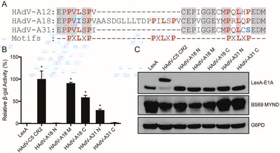 Analysis of BS69 interaction with the E1A proteins from HAdV-A18 and -A31. (A) Sequence alignment of the relevant portions of HAdV-A12, -A18, and -A31. PXLXP like sequences are indicated in red, with divergent residues indicated in blue. (B) The indicated fragments corresponding to the N-terminal (N), middle (M), and C-terminal (C) PXLXP motifs in HAdV-A18 and -A31 E1A were tested for interaction with BS69 MYND by yeast two-hybrid analyses. Results are shown as mean ± SD of percent activity normalized to HAdV-C5 CR2 positive control, n = 3. Significance markers are assigned in comparison to the LexA negative control (* p ≤ 0.05). (C) Western blot analysis of expression of the motifs tested.