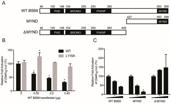 E1A is the first viral protein expressed upon HAdV infection, and one of its main functions is to activate the transcription of other early viral genes []. As E1A has no specific DNA-binding nor enzymatic activity, it relies on binding to host factors to facilitate its recruitment to the promoters of target genes [,,]. Once tethered to a promoter, E1A is able to stimulate transcriptional initiation and elongation [,,,]. Overexpression of BS69 has been previously shown to suppress HAdV-C5 E1A-mediated transactivation, dependent on an intact PXLXP motif [,]. We constructed a similar luciferase assay system in mammalian cells to further study the molecular determinants of BS69 repression of E1A transactivation, and the role of the MYND domain in particular, using BS69 truncations (Figure 8A).