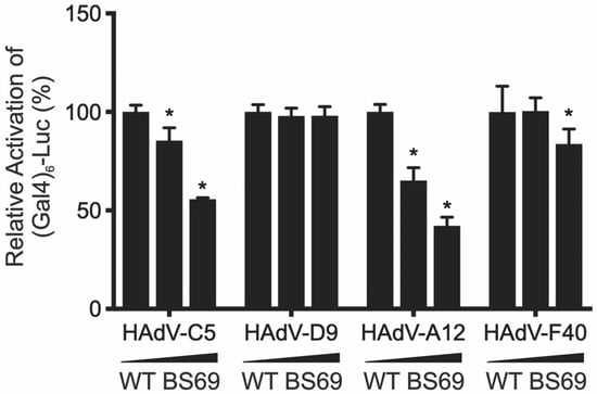 The levels of transcriptional activation are dramatically different between the E1A proteins of distinct adenovirus types, yet they all interact similarly with many of the same components of the cellular RNA polymerase II transcription apparatus []. Thus, the cause of the differences in the relative strengths of E1A-mediated transactivation between different HAdV types is not well understood []. As BS69 represses E1A transactivation and binds to E1A from different species with varying affinity, we set out to determine how BS69 affected E1A-dependent transcription across different HAdV species using the GAL4 luciferase assay.
