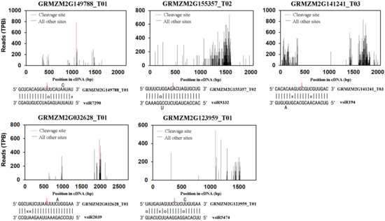 To understand the potential regulatory and biological functions, it is essential to find the target sites for si/miRNAs [9]. In plants, AGO-mediated cleavage of mRNA targets often takes place precisely between the 10th and 11th nucleotides from the 5′-end of miRNA, which is also valid for vsiRNA-mediated RNA cleavage [4]. The resulting 5′-uncapped and polyadenylated fragments of the cleaved target RNAs can be identified and characterized, although the upstream fragments are rapidly degraded [10]. To date, 5′-rapid amplification of cDNA ends (RACE) has been used to identify miRNA-mediated cleavage sites, yet it is only suitable on a small scale due to its low efficiency [9,11]. Recently, degradome analysis has been widely established in plants, which is a new and efficient strategy to identify si/miRNA-mediated cleavage sites on a large scale [11,12,13].