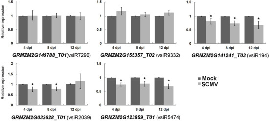 The expression of maize transcripts targeted by vsiRNAs in Mock- and SCMV-inoculated maize plants. The expression levels of the indicated target genes were determined by qRT-PCR at 4 dpi, 8 dpi and 12 dpi, respectively. Three independent experiments were conducted with at least three biological replicates each and the data were analyzed using a two-sample t-test. An asterisk indicates a significant difference (p-value < 0.05). Bars represent the means ± SD.