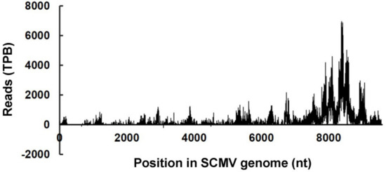 Distribution of vsiRNA-directed cleavage sites along the viral genome of SCMV. Reads of viral 5′-uncapped ends were normalized to the transcripts per billion (TPB) reads. Bars above the axis represent the cleavage sites in the sense strand of SCMV RNAs; those below represent the cleavage sites in the antisense strand of SCMV RNAs.
