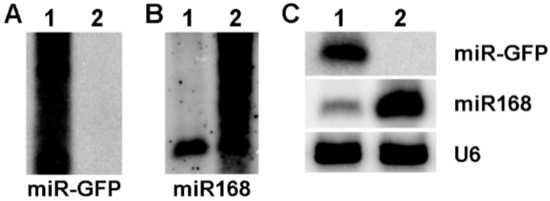 The expression of amiRNAs in maize protoplasts. (A) The expression of miR-GFP based on the precursor of ath-miR319a as backbone. (B) The expression of miR168 based on the precursor of ath-miR319a as backbone. (C) The expression of amiR-GFP and miR168 based on the precursor of osa-miR528a as backbone. U6 was used as a loading control. 1: The expression of miR-GFP; 2: The expression of miR168.