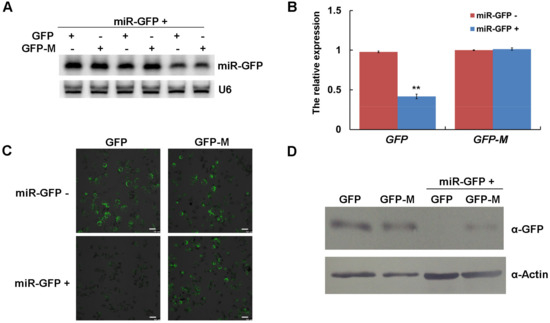 The expressed miR-GFP could silence the target GFP in maize protoplasts. (A) The expression of miR-GFP in maize protoplasts was detected by Northern blotting. Three independent experiments were conducted. U6 was used as a loading control. (B) The relative accumulation of GFP and GFP-M mRNAs in maize protoplasts was determined by qRT-PCR. Three independent experiments were conducted with at least three biological replicates and the data were analyzed using a two-sample t-test. Bars represent the grand means ± SD. “**” indicate a significant difference (p-value < 0.01). (C) The green fluorescence of GFP and GFP-M in maize protoplasts was observed with confocal microscopy, scale bar = 50 μm. (D) The expression of GFP and GFP-M in maize protoplasts was detected by Western blotting. Actin was used as a loading control.