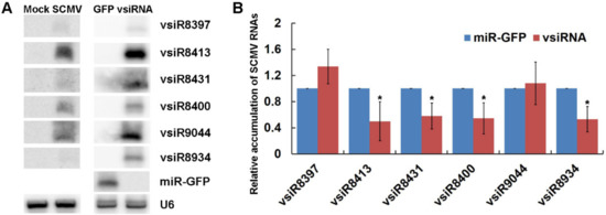 The expressed vsiRNAs could silence SCMV RNAs in maize protoplasts. (A) The accumulation of vsiRNAs was determined by Northern blotting in SCMV-inoculated maize plants and in maize protoplasts co-expressed with SCMV RNAs. Mock and SCMV indicated Mock- and SCMV-inoculated maize plants, respectively. GFP and vsiRNA indicated the maize protoplasts expressed miR-GFP and vsiRNAs, respectively. U6 was used as a loading control. (B) The relative accumulation of SCMV RNAs in maize protoplasts was determined by qRT-PCR when co-expressed miR-GFP or vsiRNAs. Three independent experiments were conducted with at least three biological replicates and the data were analyzed using a two-sample t-test. Bars represent the grand means ± SD. “*” indicate a significant difference (p-value < 0.05).
