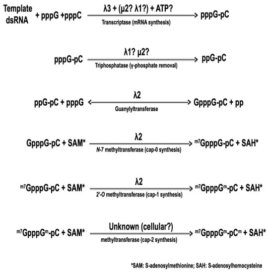 The 5′-end of the viral mRNA harbors a cap structure that is synthesized by sequential enzymatic steps that are essentially identical to those of cellular mRNA cap synthesis, although catalyzed by viral core-associated enzymes, as summarized on Figure 2, below. The nature of the viral protein responsible for the first step of cap synthesis, namely the RNA triphosphatase (or phosphohydrolase) removing the first phosphate at the 5′-triphosphate end of the newly synthesized RNA, also remains controversial. Again, both μ2 and λ1 exhibit such an activity in vitro [,] with very similar enzymatic parameters. In both cases, the affinity for the substrate as measured by the Michaelis–Menten kinetics was shown to be 10-fold better for 5′-triphosphorylated RNA than for free nucleotides. It thus remains possible that one or the other of the two proteins first acts as an NTPase/helicase but is then preferentially active on the nascent RNA substrate.