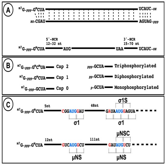Structure of reovirus RNA. (A) The structure of a viral dsRNA genome segment is presented with the different 5′ and 3′-terminal structure and conserved sequences at both ends, as observed for mammalian orthoreoviruses. The structure of a typical mRNA is presented with the length of both 5′ and 3′ non-coding regions. (B) Schematic representation of the different possible capped and uncapped 5′-end on mRNA. (C) Schematic representation and nucleotide sequence at the two translational initiation sites on s1 and m3 mRNAs.