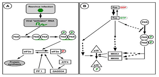 In apparent contradiction, other data indicate that in the absence of PKR in murine embryonic fibroblasts, reovirus replication is actually reduced; this suggests that a certain level of cellular stress is required for efficient virus replication, at least in some cell types and with some viral strains []. This could be reconciled if one considers the multiple roles that PKR plays in the cell, normal or infected [,]. Although it is not possible to discuss this point in detail herein, an interesting observation is the fact that PKR can contribute to activation of the p38 pathway. Stimulation of the same pathway was previously shown to be involved in the stimulation of reovirus replication following Ras transformation [,]. Partial schematic representations of these pathways are presented on Figure 4.