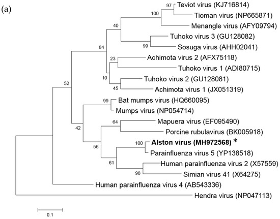 The GenBank accession number for the Alston virus sequence is MH972568. Virus sequences used in phylogenetic analysis TevPV (KP271123), TioPV (NP665871), MenPV (AFY09794), PIV5 (YP138518), hPIV2 (X57559), Achimota virus 1 (AchPV1, JX051319), Achimota virus 2 (AchPV2, AFX75118), human parainfluenza virus 4 (hPIV4, AB543336), bat mumps virus (bat-MuV, HQ660095), MapV (EF095490), MuV (NP054714), simian virus 41 (SV41, X64275), PorV (BK005918), Tuhoko virus 1 (ThkPV1, ADI80715), Tuhoko virus 2 (ThkPV2, GU128081), Tuhoko virus 3 (ThkPV3, GU128082), Sosuga virus (SosPV, AHH02041), and HeV (NP047113).