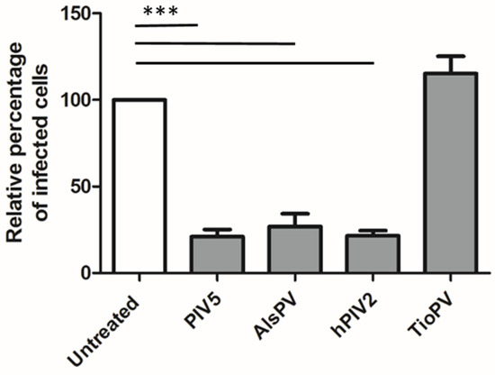 Effect of Arthrobacter ureafaciens neuraminidase treatment on AlsPV, PIV5, hPIV2 and TioPV infection of Vero cells. Infected cells were counted and averaged across nine fields of view and compared to infected but untreated cells. TioPV was included as a control because it lacks the NRKSCS motif and was therefore not expected to bind sialic acid. Values represent a percentage of the number of infected cells counted in untreated samples. Error bars represent standard error of the mean. Significance calculated by one-way ANOVA followed by Dunnett’s multiple comparison test (compared to untreated cells). *** represents a p value of <0.001. n = 2 independent experiments.