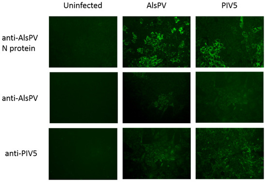 Antigenic cross-reactivity between PIV5 and AlsPV by immunofluorescence assay. Vero cells were infected AlsPV or PIV5 and stained with either rabbit sera raised against an N protein peptide of AlsPV, ferret sera resulting from infection with AlsPV, or anti-PIV5 guinea pig sera (magnification ×20).