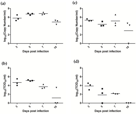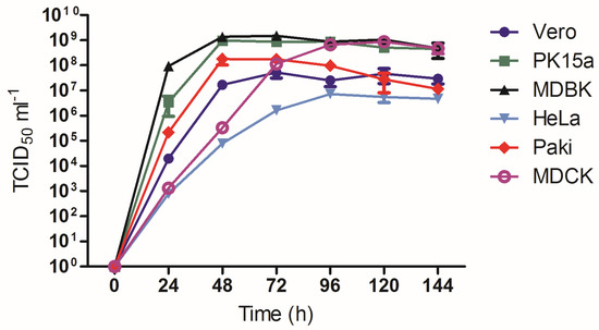 10-fold serial dilutions of virus stocks were combined with Vero cells in 96-well plates to determine the 50% tissue culture infectious dose per milliliter (TCID50/mL). Virus titers were calculated using the Reed–Muench method [30].