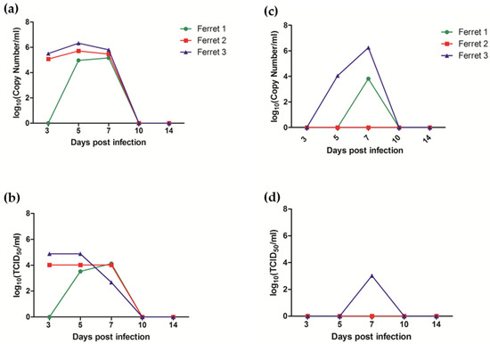Shedding of AlsPV in ferret respiratory secretions following oronasal exposure. Graphs present log transformations of the (a) copy number of AlsPV N gene per ml of nasal wash sample, (b) titer of AlsPV isolated from nasal wash, (c) copy number of AlsPV N gene per ml of oral swab sample, and the (d) titer of AlsPV isolated from oral swabs.