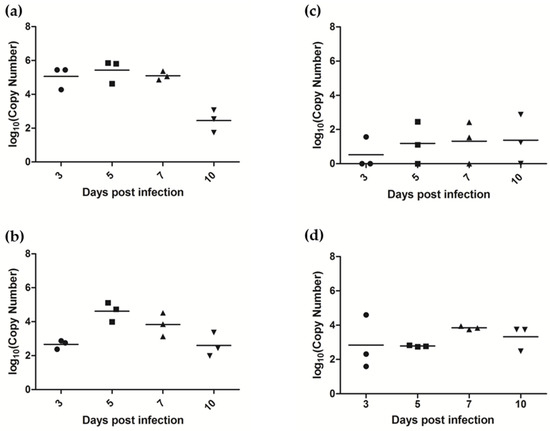 Shedding of AlsPV in ferret respiratory secretions following oronasal exposure. Ferrets were sampled prior to euthanasia, either 3, 5, 7 or 10 days post infection. Graphs present log transformations of the (a) copy number of AlsPV N gene per ml of nasal wash sample, (b) titer of AlsPV isolated from nasal wash, (c) copy number of AlsPV N gene per ml of oral swab sample, and the (d) titer of AlsPV isolated from oral swabs.