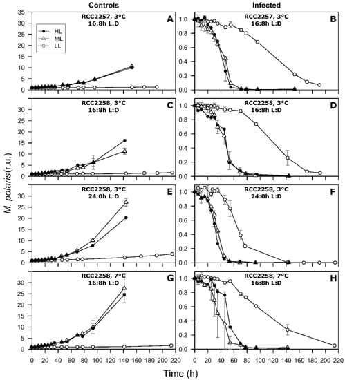 - Demory, D.; Arsenieff, L.; Simon, N.; Six, C.; Rigaut-Jalabert, F.; Marie, D.; Ge, P.; Bigeard, E.; Jacquet, S.; Sciandra, A.; et al. Temperature is a key factor in Micromonas-virus interactions. ISME J. 2017, 11, 601–612. [Google Scholar] [CrossRef] [PubMed]